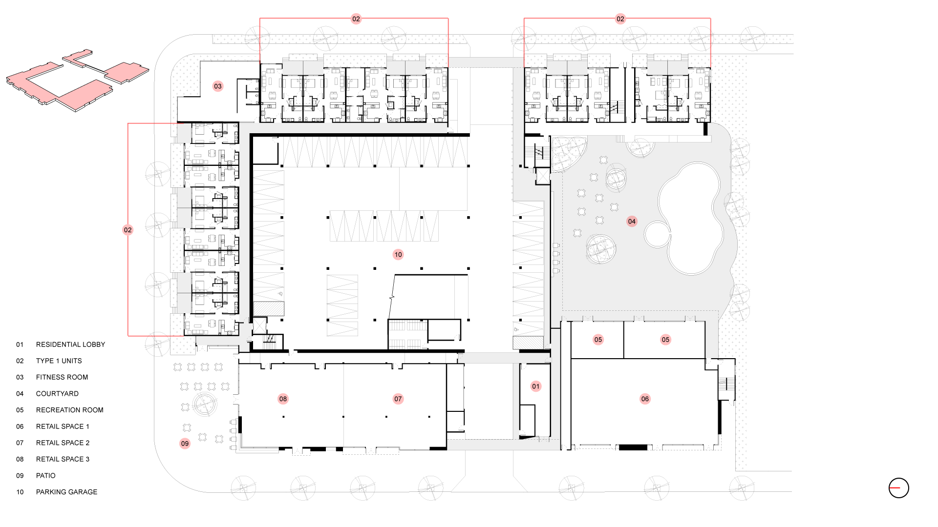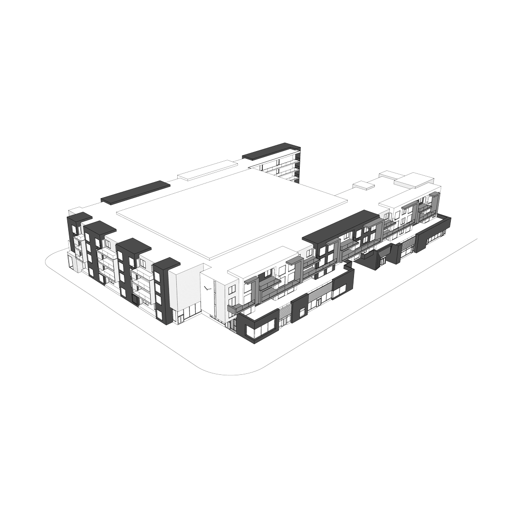 Situated on a 3-sided lot, the public plaza focuses on robust community involvement, with a prominent side of the building set aside for future public art. Retail uses on the ground floor of the active street are charming, small scale, and porous, providing a lively and safe pedestrian atmosphere. In place of one solid block, the massing is articulated with projected balconies and complementary fenestration patterns.